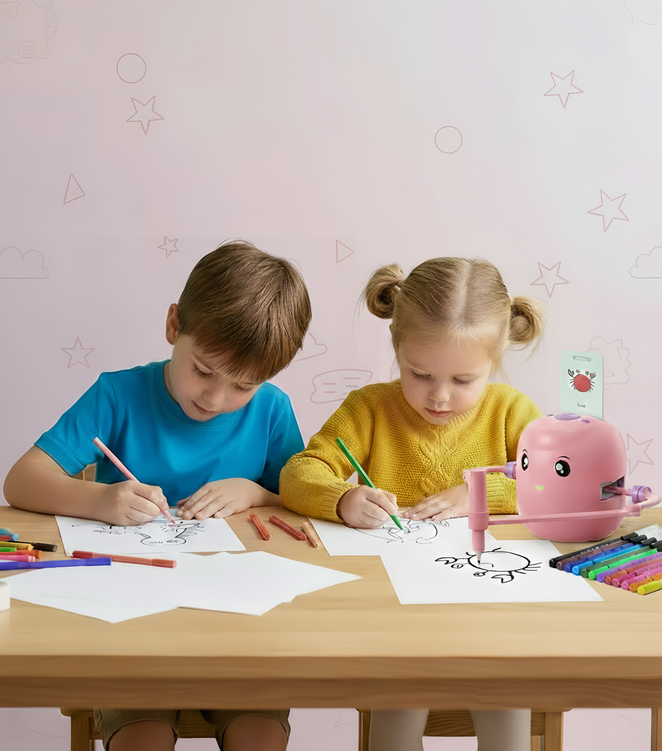The robot encourages children to express themselves freely by choosing from various image options, transforming their imaginative ideas into colorful drawings, all while minimizing the pressure of perfection, allowing true creative exploration.